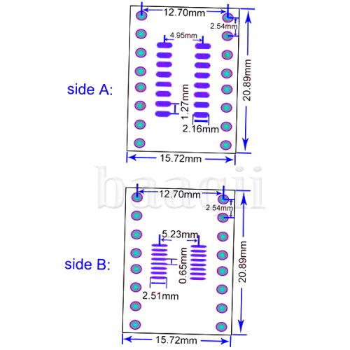 This PCB supports SO16, SOP16,SOIC16,SSOP16,TSSOP16 and MSOP16 IC packages with 1.27mm & 0.65mm pitch.Side one supports pitch size 0.65mm. It can be used for most of the MSOP16, SSOP16 and TSSOP16 packages. Side two supports pitch size 1.27mm. It can be used for most of the SO16, SOP16 and SOIC16 packages.
