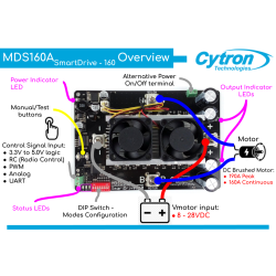 It is one of the latest smart series motor drivers. On board high current MOSFETs are switched at 16 KHz to ensure quiet operation and no annoying whining sound. And using MOSFETs eliminate the need for additional flyback diodes. Besides, it also equipped with a microcontroller unit to provide smart features such as multiple input mode, current limiting and thermal protection. SmartDrive160 can also be hooked up with another similar unit and operates in pair. This make driving a robot with differential drive a truly plug and play experience.