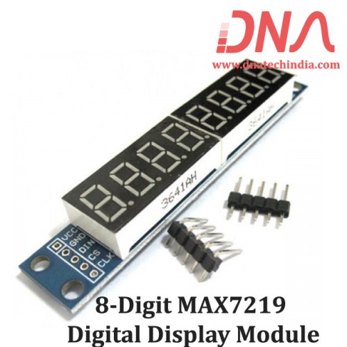 The module uses two standard 4 digit seven segment displays to display a total of 8 digits in RED with decimal point. A convenient input and output header allows additional modules to be daisy-chained and controlled with just just 3 digital IO pins.