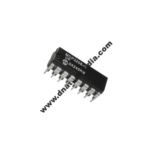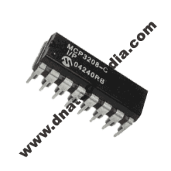 The Microchip Technology Inc. MCP3208 devices are successive approximation 12-bit Analog-to-Digital (A/D) Converters with on-board sample and hold circuitry. The MCP32084 is programmable to provide four pseudo-differential input pairs or eight single-ended inputs. Differential Nonlinearity (DNL) is specified at ±1 LSB, and Integral Nonlinearity (INL) is offered in ±1 LSB (MCP3208B) and ±2 LSB (MCP3208C) versions. Communication with the devices is done using a simple serial interface compatible with the SPI protocol. The devices are capable of conversion rates of up to 100ksps. MCP3208 ADC operates over a broad voltage range (2.7V -5.5V). Low current design permits operation with typical standby and active currents of only 500nA and 320µA, respectively. The MCP3208 is offered in 14-pin PDIP, 150mil SOIC and TSSOP packages.