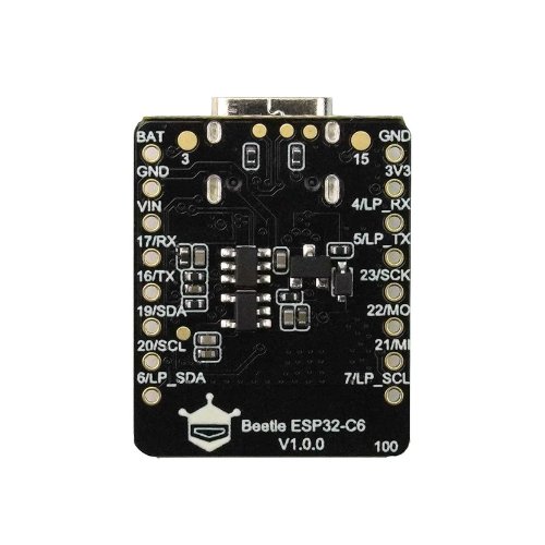 The DFRobot Beetle ESP32 C6 Mini Development Board for Wireless Smart Wearable Device (Supports BLE / Matter) is designed for low-power applications. With a compact size of 25*20.5mm, it features a 160MHz RISC-V 32-bit processor and supports multiple communication protocols including Wi-Fi 6, Bluetooth 5, and Zigbee 3.0. This board is ideal for creating IoT devices that require efficient connectivity.