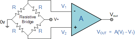| The Differential Amplifier circuit is a very useful op-amp circuit and by adding more resistors in parallel with the input resistors R1 and R3, the resultant circuit can be made to either "Add" or "Subtract" the voltages applied to their respective inputs. One of the most common ways of doing this is to connect a "Resistive Bridge" commonly called a Wheatstone Bridge to the input of the amplifier as shown below. |