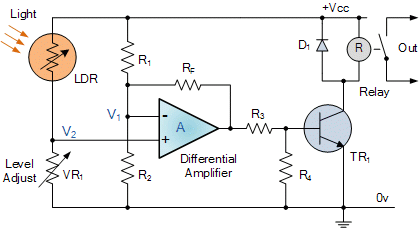 | The standard Differential Amplifier circuit now becomes a differential voltage comparator by "Comparing" one input voltage to the other. For example, by connecting one input to a fixed voltage reference set up on one leg of the resistive bridge network and the other to either a "Thermistor" or a "Light Dependant Resistor" the amplifier circuit can be used to detect either low or high levels of temperature or light as the output voltage becomes a linear function of the changes in the active leg of the resistive bridge and this is demonstrated below. | ||