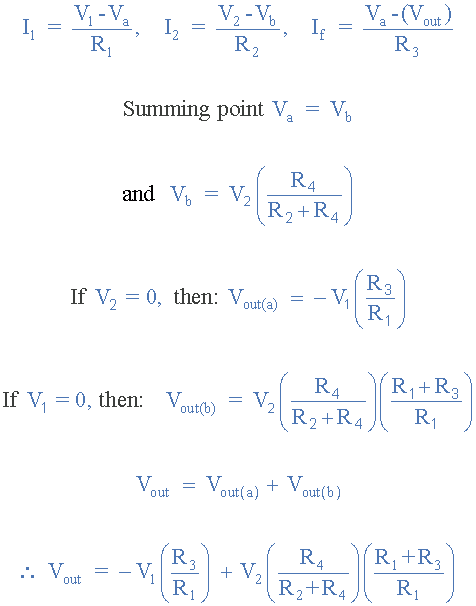 | By connecting each input inturn to 0v ground we can use superposition to solve for the output voltage Vout. Then the transfer function for a Differential Amplifier circuit is given as: |