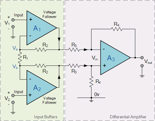 | The instrumentation amplifier also has a very good common mode rejection ratio, CMRR (zero output when V1 = V2) well in excess of 100dB at DC. A typical example of a three op-amp instrumentation amplifier with a high input impedance ( Zin ) is given below: | ||