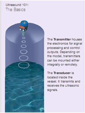 Two components make up a typical non-contact ultrasonic measurement device: the transmitter, or electronics; and the transducer, or sensor. A piezoelectric crystal within the transducer converts electrical signals generated by the transmitter into a series of ultrasonic pulses. Under ideal conditions, these pulses are transmitted through free air at the speed of sound until they come into contact with the liquid surface where they are reflected back to the transducer. The transmitter’s electronics then measures the pulse’s round-trip time and digitally processes the information to indicate liquid level. |