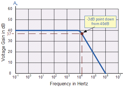 | From this frequency response curve we can see that the product of the gain against frequency is constant at any point along the curve. Also that the unity gain (0dB) frequency also determines the gain of the amplifier at any point along the curve. This constant is generally known as the Gain Bandwidth Product or GBP. | ||||||||||||||||||||||||||||||||||||||
