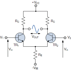 | The circuit below shows a generalized form of a differential amplifier with two inputs marked V1 and V2. The two identical transistors TR1 and TR2 are both biased at the same operating point with their emitters connected together and returned to the common rail, -Vee by way of resistor Re. | ||||||||||||||||||||||||||||||||||||||