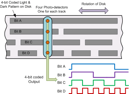 | Absolute Position Encoders are more complex than quadrature encoders. They provide a unique output code for every single position of rotation indicating both position and direction. Their coded disk consists of multiple concentric "tracks" of light and dark segments. Each track is independent with its own photo detector to simultaneously read a unique coded position value for each angle of movement. The number of tracks on the disk corresponds to the binary "bit"-resolution of the encoder so a 12-bit absolute encoder would have 12 tracks and the same coded value only appears once per revolution. | ||