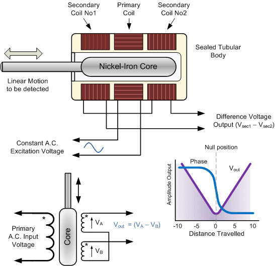 The polarity of the output signal depends upon the direction and displacement of the moving core. The greater the movement of the soft iron core from its central null position the greater will be the resulting output signal. The result is a differential voltage output which varies linearly with the cores position. Therefore, the output signal has both an amplitude that is a linear function of the cores displacement and a polarity that indicates direction of movement. |