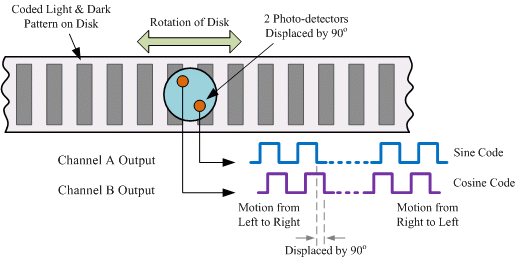| By using the Arc Tangent mathematical function the angle of the shaft in radians can be calculated. Generally, the optical disk used in rotary position encoders is circular, then the resolution of the output will be given as: θ = 360/n, where n equals the number of segments on coded disk. Then for example, the number of segments required to give an incremental encoder a resolution of 1o will be: 1o = 360/n, therefore, n = 360 windows, etc. Also the direction of rotation is determined by noting which channel produces an output first, either channel A or channel B giving two directions of rotation, A leads B or B leads A. This arrangement is shown below. | ||