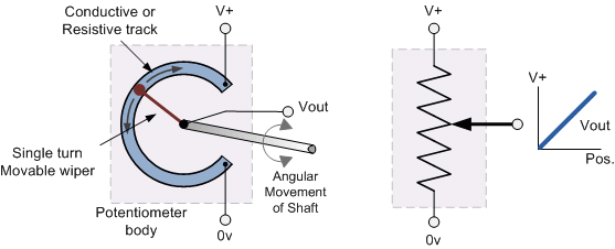 The output signal (Vout) from the potentiometer is taken from the centre wiper connection as it moves along the resistive track, and is proportional to the angular position of the shaft. |