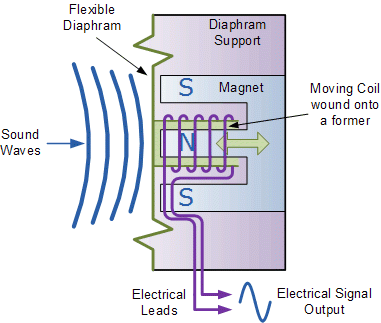 | The movement of the coil within the magnetic field causes a voltage to be induced in the coil as defined by Faraday's Law of Electromagnetic Induction. The resultant output voltage signal from the coil is proportional to the pressure of the sound wave acting upon the diaphragm so the louder or stronger the sound wave the larger the output signal will be, making this type of microphone design pressure sensitive. | ||||||||||||