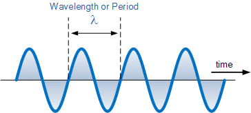 | A sound waveform has the same characteristics as that of an electrical waveform which are Wavelength (λ), Frequency (ƒ) and Velocity (m/s). Both the sounds frequency and wave shape are determined by the origin or vibration that originally produced the sound but the velocity is dependent upon the medium of transmission (air, water etc.) that carries the sound wave. The relationship between wavelength, velocity and frequency is given below as: | ||||||||||||
