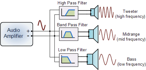 | In multi speaker enclosures which have a separate Woofer, Tweeter and Mid-range speakers housed together within a single enclosure, a passive or active "crossover" network is used to ensure that the audio signal is accurately split and reproduced by all the different sub-speakers. This crossover network consists of Resistors, Inductors, Capacitors, RLC type passive filters or op-amp active filters whose crossover or cut-off frequency point is finely tuned to that of the individual loudspeakers characteristics and an example of a multi-speaker "Hi-fi" type design is given below. | ||||||||||||