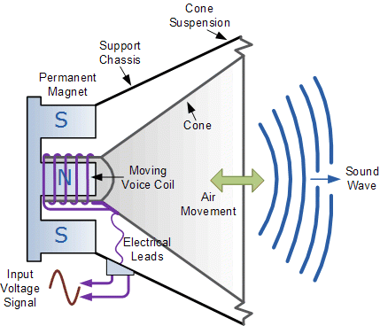 | As the voice coil is permanently attached to the cone/diaphragm this also moves in tandem and its movement causes a disturbance in the air around it thus producing a sound or note. If the input signal is a continuous sine wave then the cone will move in and out acting like a piston pushing and pulling the air as it moves and a continuous single tone will be heard representing the frequency of the signal. The strength and therefore its velocity, by which the cone moves and pushes the surrounding air produces the loudness of the sound. | ||||||||||||