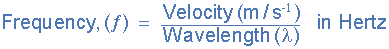 Where: Wavelength is the time period of one complete cycle in Seconds. Frequency is the number of wavelengths per second in Hertz. Velocity is the speed of sound through a transmission medium in m/s-1. |