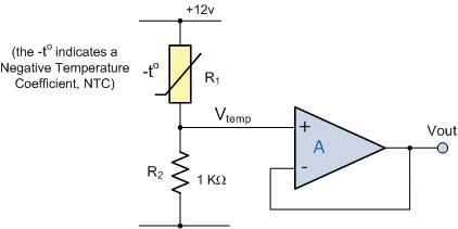 | by changing the fixed resistor value of R2 (in our example 1kΩ) to a potentiometer or preset, a voltage output can be obtained at a predetermined temperature set point for example, 5v output at 60oC and by varying the potentiometer a particular output voltage level can be obtained over a wider temperature range. | ||