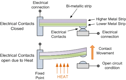 The Thermostat is a contact type electro-mechanical temperature sensor or switch, that basically consists of two different metals such as nickel, copper, tungsten or aluminium etc, that are bonded together to form a Bi-metallic strip. The different linear expansion rates of the two dissimilar metals produces a mechanical bending movement when the strip is subjected to heat. The bi-metallic strip is used as a switch in the thermostat and are used extensively to control hot water heating elements in boilers, furnaces, hot water storage tanks as well as in vehicle radiator cooling systems.
