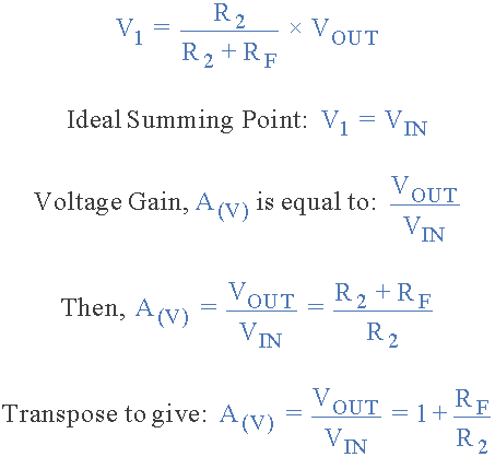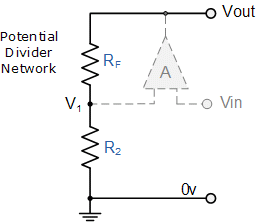 | Then using the formula to calculate the output voltage of a potential divider network, we can calculate the closed-loop voltage gain ( A V ) of the Non-inverting Amplifier as follows: | ||||