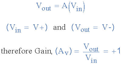 | In this non-inverting circuit configuration, the input impedance Rin has increased to infinity and the feedback impedance Rƒ reduced to zero. The output is connected directly back to the negative inverting input so the feedback is 100% and Vin is exactly equal to Vout giving it a fixed gain of 1 or unity. As the input voltage Vin is applied to the non-inverting input the gain of the amplifier is given as: |