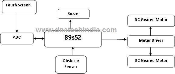 In this project a touchscreen is used as an input system to control the vehicle. The touch screen cannot be directly connected to the controller so a ADC is used in between. The controller after getting the signals from the touch screen will control the DC geared motor. We will be using 60 RPM DC geared motor. Since the controller cannot directly control the motor a Motor driver IC will be used to provide the necessary current and voltage to the motors. An IR based obstacle sensor will be used to check for obstacles. IF any obstacle is detected the robot will stop automatically and a warning buzzer will be sounded. |
