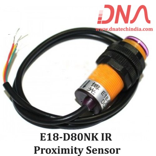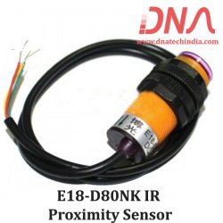 E18-D80NK is A 5 volt adjustable IR Proximity Sensor switch with a sensing range of 3 cm to 80cm. E18-D80 sensor is very easy to user IR PROXIMITY SENROR with digital output. This IR Sensor works on 5 volts and can be directly interfaced to any Microcontroller, ESP8266, ESP32, Arduino and even Raspberry Pi. The E18-D80 IR sensor has an adjustable sensing distance from 3 cm to 80 cm and this sensing distance can be easily adjusted using the trim pot (multiturn Potentiometer) at the base of the E18 sensor.